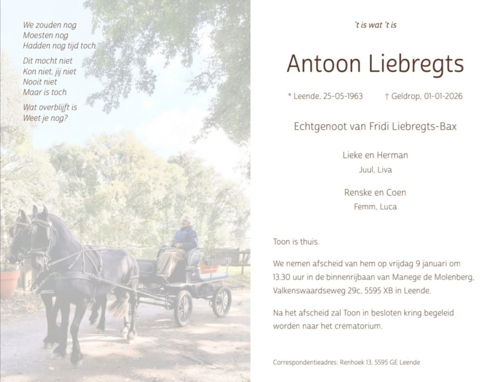 Helaas ontvingen wij het droevige bericht dat Toon Liebregts, eigenaar van manege de Molenberg, na een kort ziekte bed is overleden. Wij wensen familie en vrienden veel sterkte toe in deze moeilijke periode.
